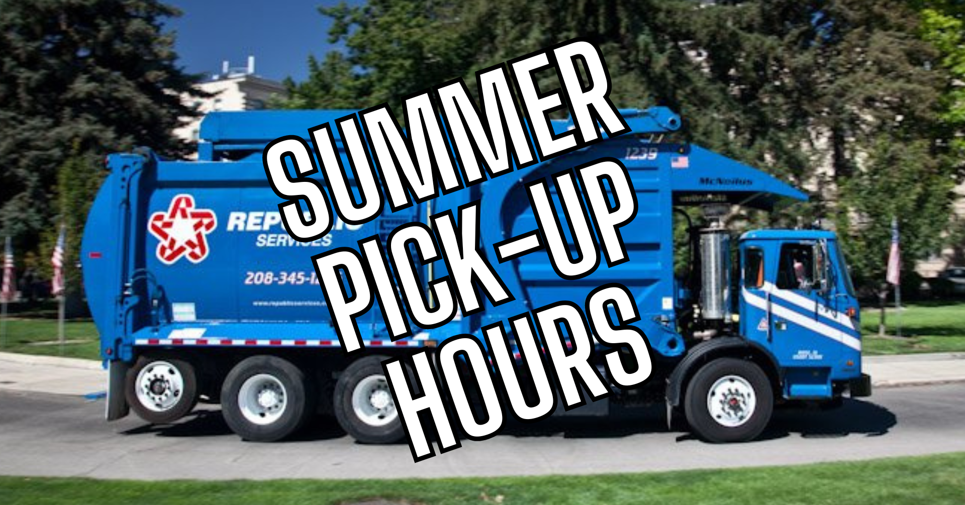 Dear residents of Huber Heights Ohio, due to the extreme summer heat Republic Services will move the service time to 5 am for your trash and recycling pick-up. We will start the time change on Monday, June 24th, 2024, and stay on this time change until September 9th, 2024. On September 9th we will move the service time back to normal time. Republic Services would like to thank you for being patient with us as we have had many obstacles to overcome, Republic Services is dedicated to Huber Heights.