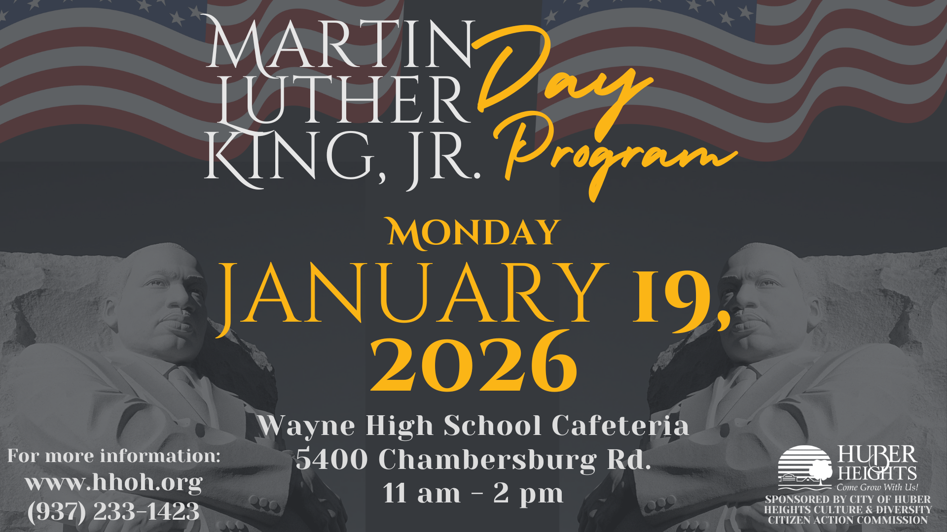 The City of Huber Heights Culture and Diversity Citizen Action Commission (CDCAC) will hold its Annual MLK Luncheon and Program on Monday, January 19, 2026, at Wayne High School (5400 Chambersburg Rd) from 11 am-2 pm. Huber Heights community members and those in surrounding areas are invited to attend this free event.